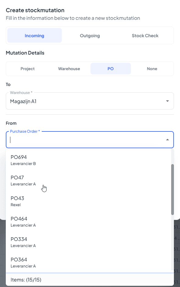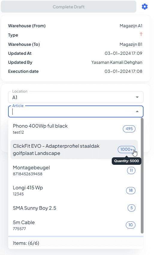 π Switching warehouses in the mutations overview now shows the correct articles.
